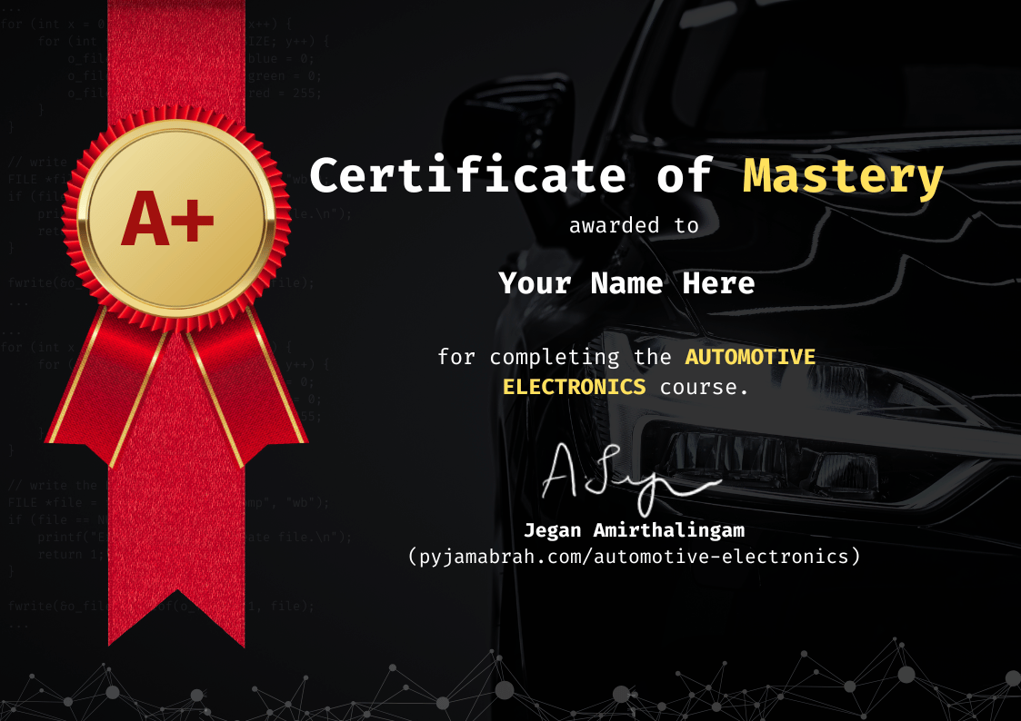 This course provides a structured, end-to-end understanding of modern vehicle electronics — from foundational E/E architecture and sensors to advanced vehicle diagnostics, software stacks, and the latest automotive trends. The curriculum blends theory, systems engineering, and hands-on demos to provide a broader perspective on roles in automotive embedded systems, diagnostics, and E/E system development.